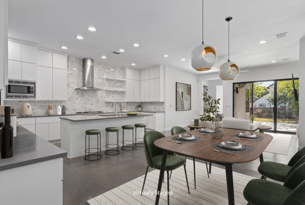 New in Crestview - freshly painted! This contemporary home has an open-concept layout, soaring 10’ ceilings, and 8’ doors throughout. Large windows and designer lighting fill the home with natural light and warmth. The entertainer’s dream kitchen features custom cabinetry, a white Calacatta marble backsplash, Bosch stainless steel appliances, gas cooktop and built-in oven, a built-in wine fridge and a huge island with quartz countertops. A ventless gas fireplace anchors the spacious living area, complemented by eco-friendly concrete floors on the main level and natural White Pine hardwoods upstairs. The upstairs primary suite includes dual vanities, 2 separate walk-in closets, and a private covered terrace—perfect for morning coffee or evening relaxation. Additional home features include a bonus living space on the 2nd level, an upstairs laundry and a mudroom right off the oversized one car garage. Enjoy outdoor living on the covered patio overlooking the expansive yard. There is even room for a pool! Existing EV charger installed and ready for your use. Google fiber available. Located just minutes from the Crestview MetroRail station and the bustling Burnet Road corridor, this home puts you in the heart of one of North Central Austin’s most dynamic districts. The Crestview area hosts tons of local favorites, boutique retail & service shops. Several nearby options for foodies. Don’t miss this gem!