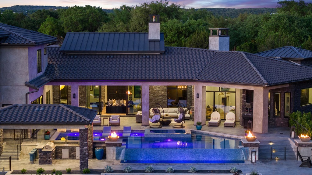 Nestled on a serene cul-de-sac, this stunning Modern Venetian residence, completed in 2021, seamlessly blends timeless architecture w/ contemporary charm. The home is situated on 1.13 acres, with a southwest orientation that captures the hill country panoramas and glimpses of Lake Travis, while graciously welcoming southern breezes. Meticulously crafted, the residence strikes a harmonious balance between seclusion and sweeping vistas. Its intelligently curated layout accentuates al fresco living, with the great room and gourmet kitchen effortlessly spilling onto an expansive veranda & poolside haven, perfect for social gatherings or tranquil moments. The owner's suite, a sanctuary of comfort, features private veranda access, a cozy fireplace, and a lavish ensuite bath w/ ample natural light. Adjacent, a spacious study provides a stylish and tranquil workspace. The recreational wing overlooks the outdoor oasis, offering entertainment options aplenty, from the poolside bar and game room to the media center and stylish wet bar. Completing the home, a 3.5-car garage with ample storage, a convenient laundry/mudroom with pet access, and a second level dedicated to guest accommodations, each with private baths and captivating views. Located in the prestigious gated Reserve at Lake Travis, residents enjoy access to the acclaimed Lake Travis ISD schools, coupled with an enviable locale a mere 15 miles away from the Hill Country Galleria, renowned for its upscale boutiques, culinary delights, and convenience to Whole Foods market. For the boater, a state-of-the-art marina resides within the community. Resort-style opulence, this residence epitomizes both luxury & seclusion, offering an idyllic retreat in an unparalleled setting. The Reserve is an active luxury waterfront community nestled among 311 acres of hill country beauty, surrounded by miles of Lake Travis shoreline w/ an in-neighborhood marina. Seller will convey boat slip lease in marina, boat also available for sale.
